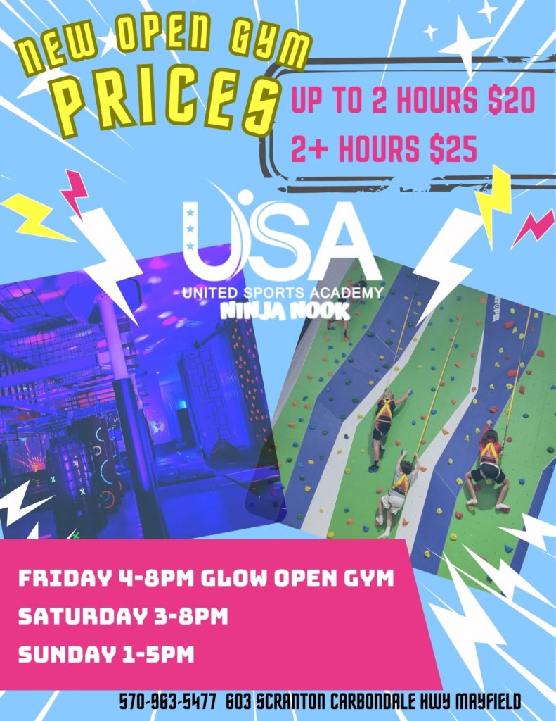 GLOW OPEN GYM PRICING of $20 for 2 hours or $25 for 4 hours.