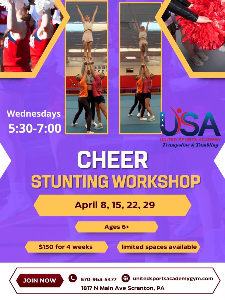 BACK by popular demand for April on Wednesdays beginning April 8th, Stunting for Cheer with Coach Addy from 5:30-7:00