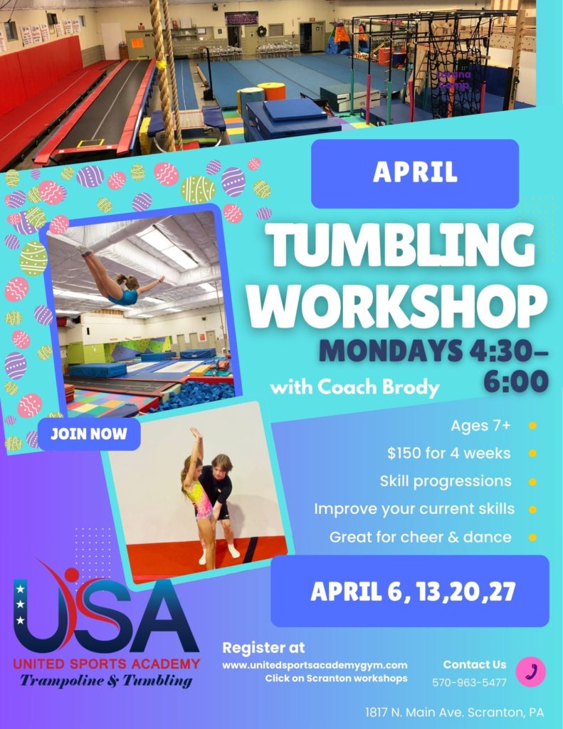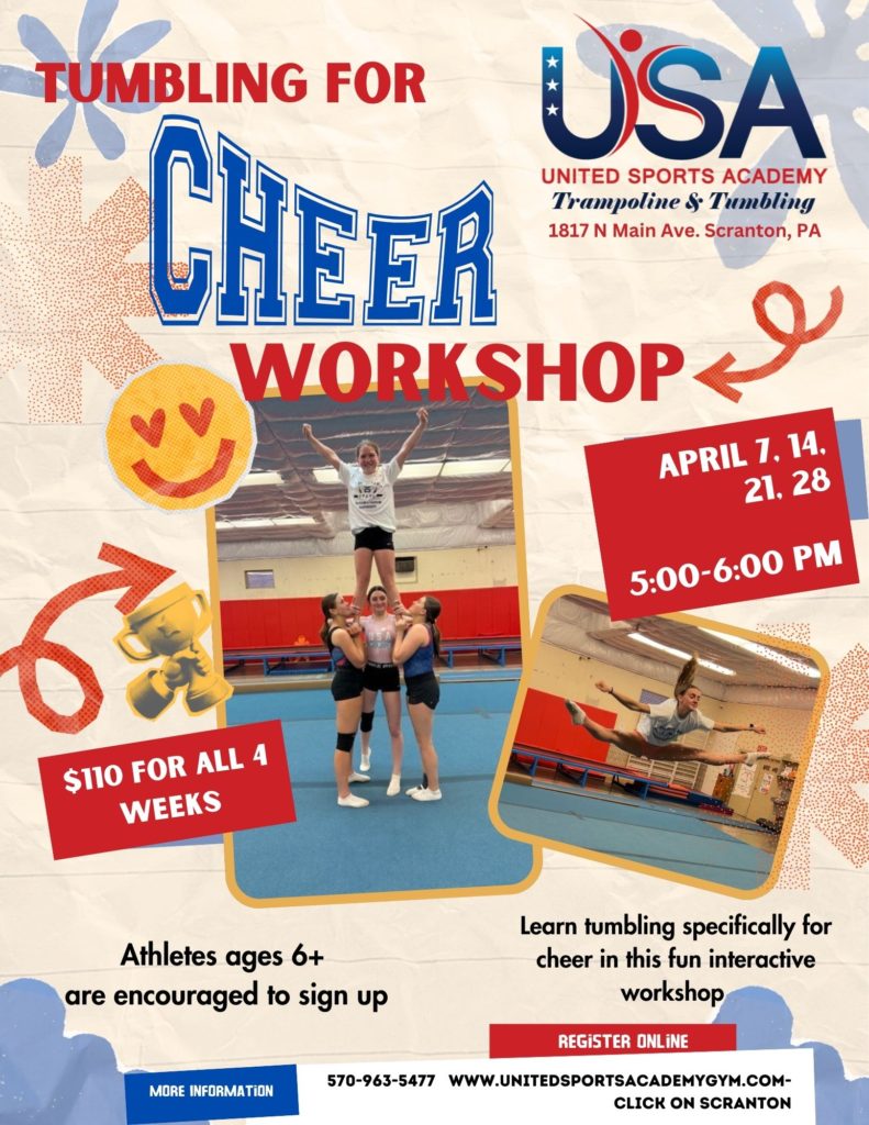 April Tumbling for Cheer workshop will be held on Tuesdays beginning April 7th from 5:00-6:00 at our Scranton location. This 4 week workshop will teach your child cheer specific tumbling for those ages 6+